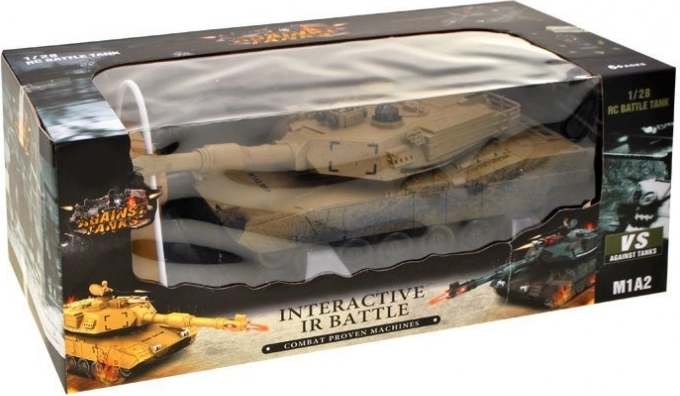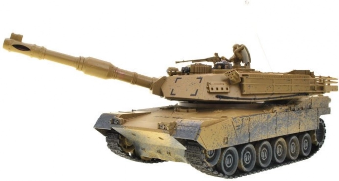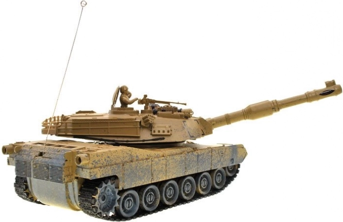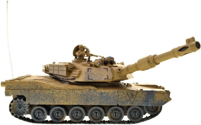 Char RC M1A2 Abrams en camouflage désert avec effets LED, sons, tourelle pivotante et chenilles en caoutchouc. Set complet avec accumulateur et radiocommande 27 MHz.