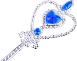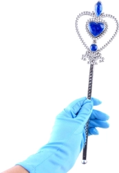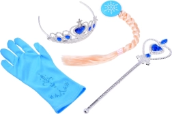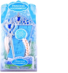 Une broche bleue décorative avec une tresse blonde courbée est facilement attachée et permet de ressembler au personnage de conte de fées préféré. La couronne et le sceptre sont des compléments indispensables pour chaque fille de princesse, conçus de manière astucieuse et ornés de petits animaux bleus en plastique. Le flacon de caviar est une décoration élégante qui complète la tenue de la petite fille.