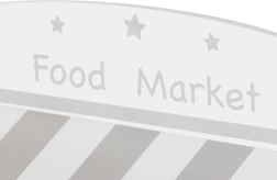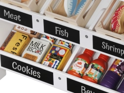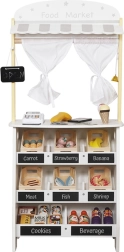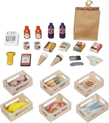Le set comprend une caisse avec terminal de paiement, un lecteur, de l’argent factice, des cagettes en bois avec aliments, un sac en papier, une clochette et des autocollants décoratifs. Les enfants acquièrent les bases du calcul, de la littératie financière et de la coopération, tout en s’exerçant à écrire et lire sur les ardoises.
