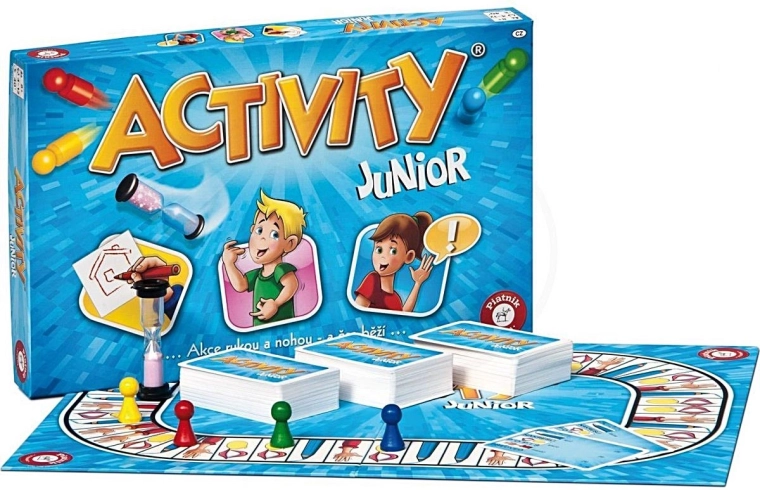 Amusement Activity Junior maintenant aussi pour les enfants à partir de 8 ans. Cette version est destinée à nos juniors. Les notions sont plus simples, mais toujours adaptées aux enfants. Déroulement du jeu : Les équipes essaient de deviner, grâce à une mimes habile, une description ou un dessin, les notions représentées et avancent ainsi sur le plateau de jeu. L’équipe qui atteint la case d’arrivée en premier gagne. Le jeu contient : 1 plateau de jeu, 330 cartes de jeu chacune avec trois notions, 4 pions en bois, 1 sablier, 1 livret de règles du jeu
