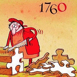 Puzzle Histoire drôle, première partie (Historia Comica Opus 1) – de la naissance du Christ à l’an 2000, emballé dans une boîte triangulaire originale, contenant une affiche servant de modèle pour l’assemblage. Les descriptions des événements sont trilingues (anglais, allemand, français).