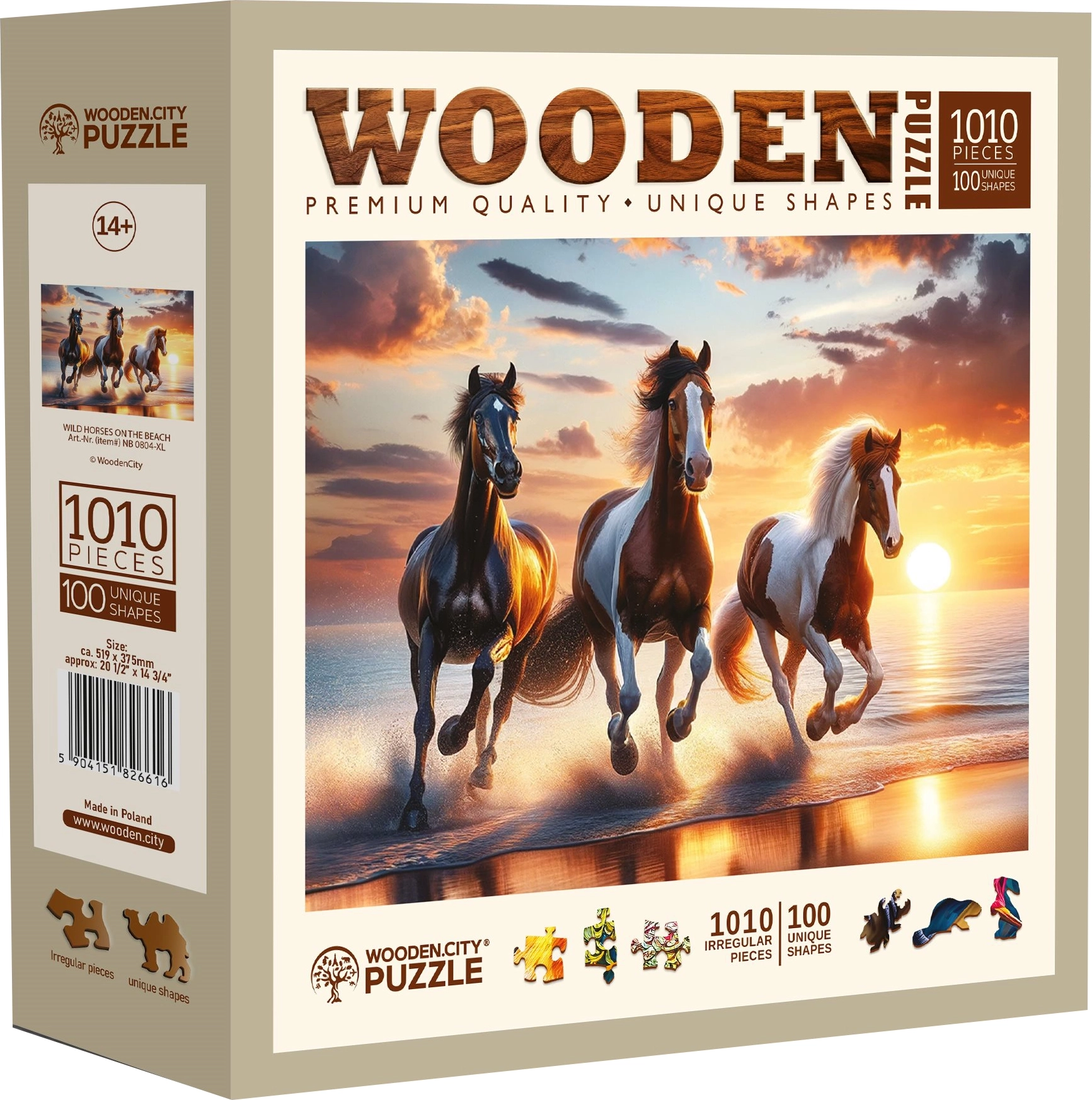 Découvrez le puzzle en bois premium WOODEN CITY avec un motif de chevaux sauvages sur la plage, qui séduit par ses pièces aux formes uniques et sa découpe laser de haute précision. Grâce aux pièces spéciales en forme d’animaux, l’assemblage est non seulement amusant mais aussi stimulant. Détails accentués au laser, bords lisses sans échardes et emballage écoresponsable sans plastique en font un cadeau idéal pour les amoureux des puzzles et de la nature.