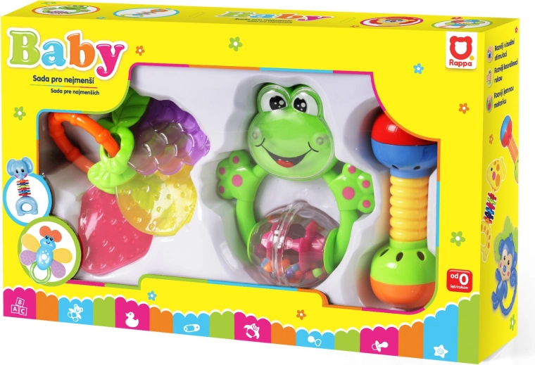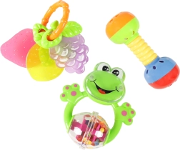 Ce set coloré de 3 pièces comprend un hochet grenouille, une haltère avec éléments sonores et un anneau de dentition en forme de fruit. Les jouets sont légers, sûrs et conçus pour être facilement saisis par le bébé. Les sons émis et les couleurs contrastées stimulent la curiosité et favorisent le développement des sens.