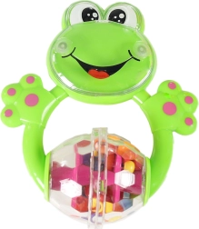 Un hochet léger avec le rire de la grenouille et des billes dans un centre transparent développe l’ouïe et la coordination œil-main.