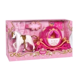 Laissez vos enfants plonger dans un univers de fantaisie avec ce magnifique set de jeu, comprenant un cheval blanc à longue crinière, prêt à être coiffé avec des peignes et brosses roses. Le carrosse au design de conte de fées offre sons et lumières, idéal pour les jeux créatifs.