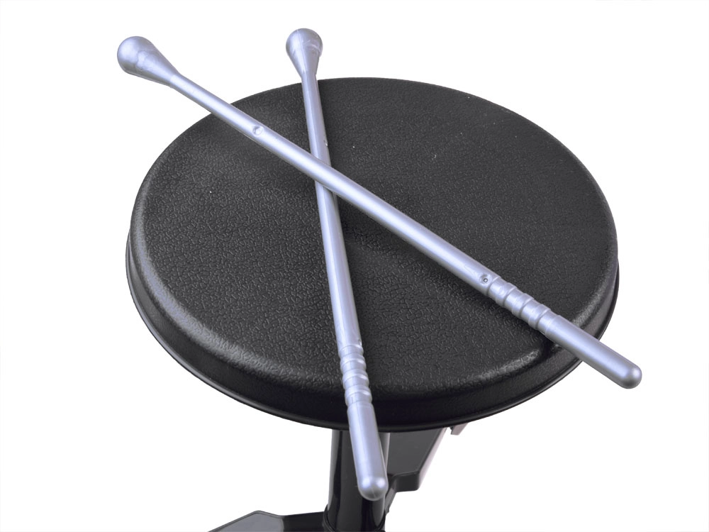 - Équipement complet : 1 grosse caisse avec pédale, 2 toms moyens, 2 petits toms, cymbale, 2 baguettes, tabouret.