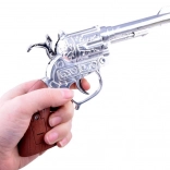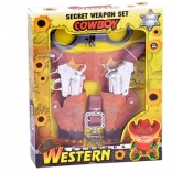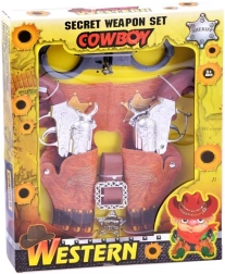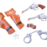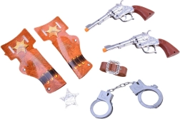 Le set inclut tout le nécessaire pour un jeu de cow-boy réaliste : 2 revolvers, des menottes, une ceinture et une étoile de shérif.