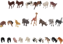 • grandes figurines : mouton, éléphant, cheval, girafe, vache, zèbre, rhinocéros, hippopotame, chèvre, antilope, puma, tigre, sanglier, lion, loup, hyène, 2× gorille, 2× ours polaire, 2× panda, 2× âne