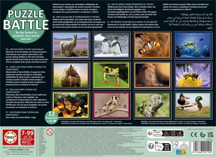 Découvrez le concept unique de bataille de puzzles de la marque EDUCA. La boîte contient 12 mini puzzles individuels, chacun de 42 pièces, ainsi que 12 cartes modèles. Idéal pour de courtes parties compétitives comme pour de longs après-midis ludiques en famille.
