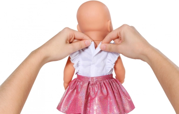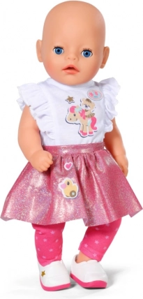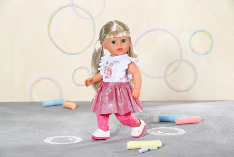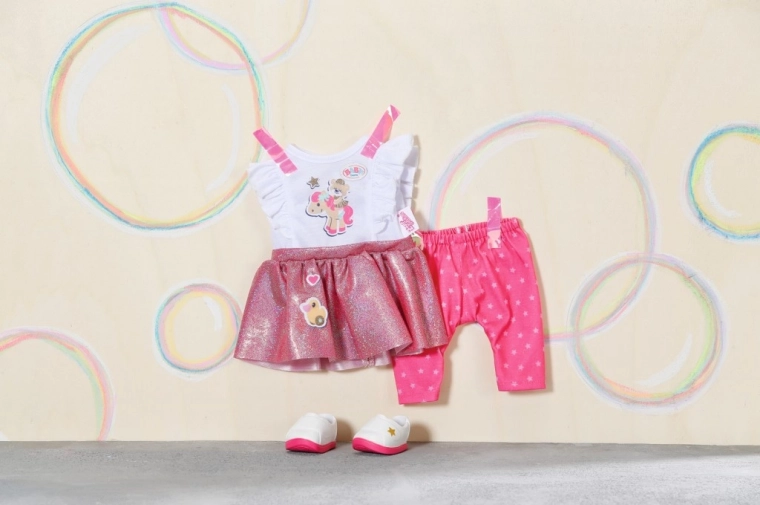 Offrez à votre poupée BABY born Little (36 cm) une tenue magique qui allie confort et style. Le haut blanc à manches volantées et imprimé ludique peut se porter seul comme une petite robe ou s’associer aux leggings roses à motif étoilé et à la jupe scintillante. L’ensemble est complété par des petites chaussures blanches ornées de détails étoilés pour un look parfaitement harmonisé.