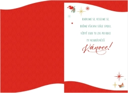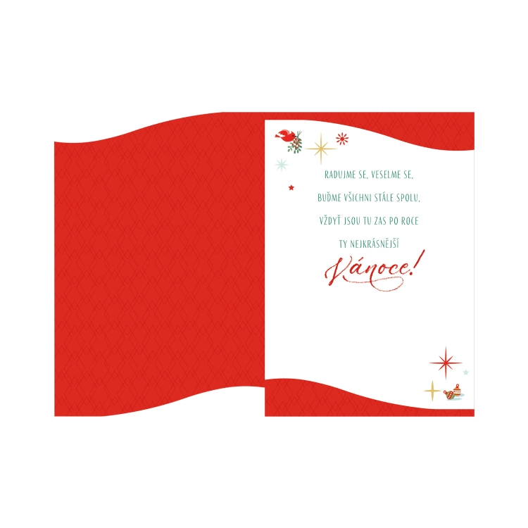 Jolie carte de vœux de Noël avec un texte charmant et une forme originale de la couverture. Dimensions de la carte : 13,5 × 19,5 cm. Texte à l’intérieur de la carte : Réjouissons-nous, soyons dans l’allégresse, restons tous toujours ensemble, car voici revenus, après un an, les plus belles fêtes de Noël !