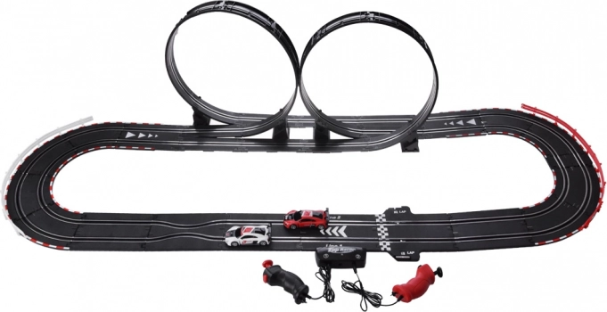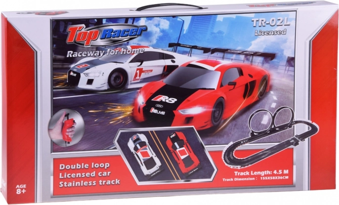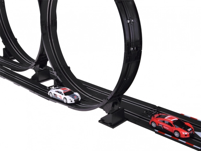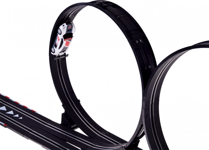 Profitez de courses palpitantes à la maison avec un circuit électrique de 4,5 m équipé de 2 voitures AUDI sous licence et de loopings doubles. Les commandes filaires avec fonction d’accélération, les garde-corps et marquages réalistes ainsi que l’alimentation secteur garantissent une conduite rapide, stable et sûre, sans piles.