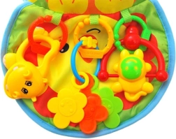 Le mini tapis bruissant coloré et les hochets amovibles encouragent le développement de la vue, de l’ouïe et de la motricité fine.