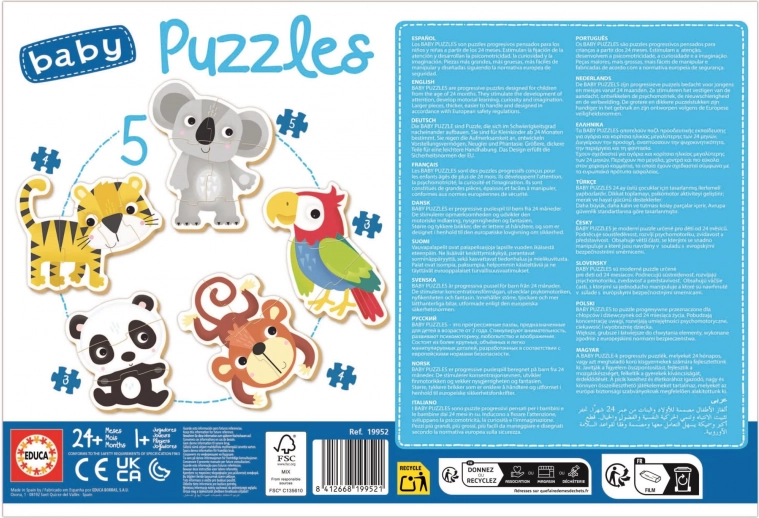 Les Educa baby puzzle Animaux sauvages 5-en-1 sont spécialement conçus pour les jeunes enfants qui débutent avec les puzzles. Grâce au nombre de pièces croissant (de 3 à 5), les enfants gagnent en confiance et en patience de manière ludique. Les grandes pièces épaisses sont faciles à saisir et s’emboîtent parfaitement.