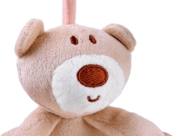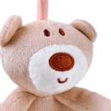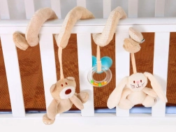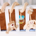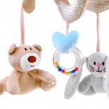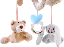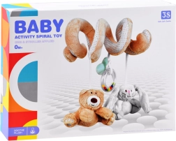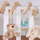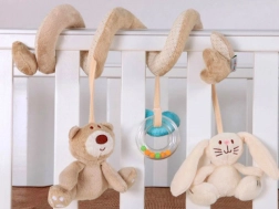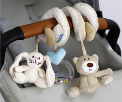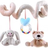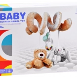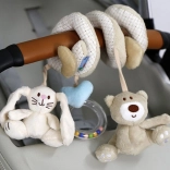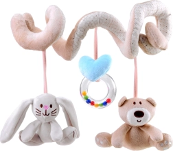 La spirale en peluche comprend trois jouets suspendus qui favorisent le développement des sens : un ourson, un lapin et un anneau avec des perles.