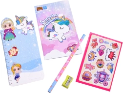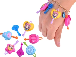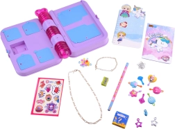 - 7 clés; crayon; taille-crayon; chaîne; 2 pendentifs pour bracelets; perles colorées; chaîne pour bracelet; décoration – cœur pliant; crochets; pendentifs; autocollants; carnet; règle en carton à motif princesse; marque-page licorne