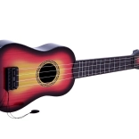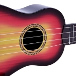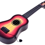 Légère guitare pour enfants avec imitation bois, 4 cordes métalliques et réglage sur le manche, idéale pour les premiers pas musicaux. Livrée avec un médiator, elle offre un son clair et agréable et une prise en main confortable pour les petites mains.