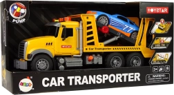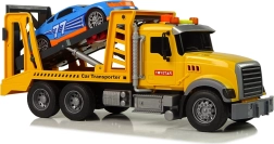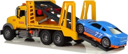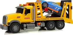 Le divertissement est assuré par des effets lumineux et sonores – klaxon, bruit de treuil avec alarme et marche arrière. Grâce à la traction à friction sur l’essieu arrière, le véhicule avance tout seul après l’avoir tiré et relâché. Est incluse une petite voiture de sport bleue avec des détails orange, facile à charger.