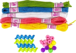 La boîte contient un large choix de perles dans des tons de rose, jaune, violet, vert, bleu et orange, ainsi que cinq fils de coton (vert, bleu, blanc, rose, jaune), chacun de 8 m. Un peigne bleu pratique et un guide détaillé pas à pas sont également inclus.