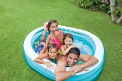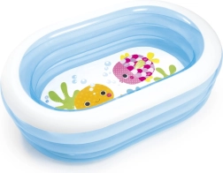 Piscine gonflable transparente pour enfants, avec un motif 1 Monde aquatique 7 au fond. La piscine est fabriquée en vinyle massif testé. Elle possède des parois transparentes, trois anneaux gonflables séparés qui sont sécurisés contre les fuites d'air non désirées et une valve de vidange. Un kit de réparation est fourni avec la piscine pour les petites réparations.