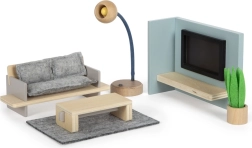 Ensemble de mobilier idéal pour une maison de poupées, qui stimule la créativité et l’imagination des enfants. Comprend des meubles au design réaliste tels qu’un canapé, une lampe sur pied, un tapis de grenier, une table basse et un panneau TV avec cartes à insérer pour changer le programme télé. Ce mobilier moderne et fonctionnel apporte joie et développement à chaque jeu d’enfant.