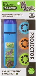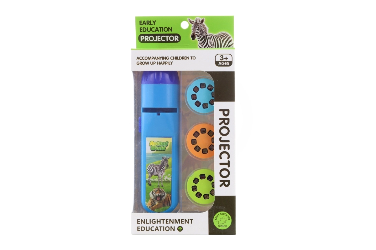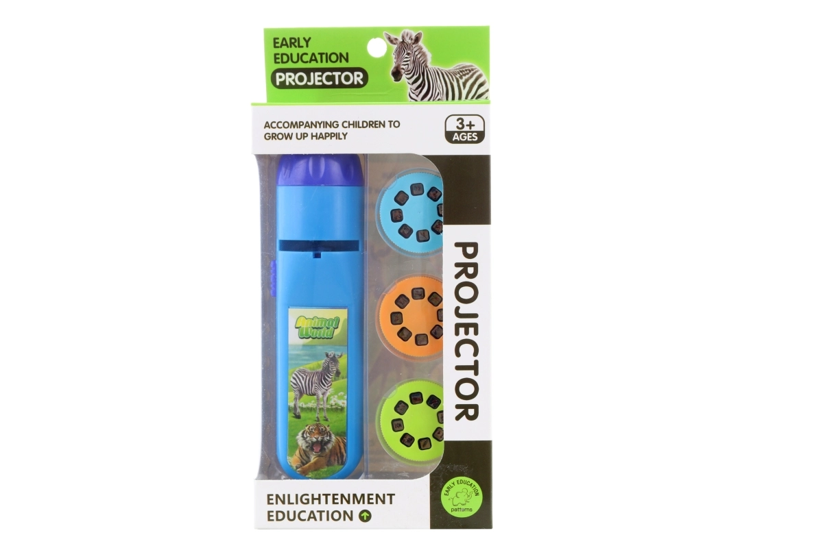 Projecteur en plastique à piles. Inclus : 3 disques d’images (24 images au total). En appuyant sur le bouton, le projecteur projette des images sur le mur (ou toute autre surface blanche). Fonctionne avec 3 piles AG13 (incluses). Dimensions du projecteur env. 13 x 3,5 cm. Dimensions de l’emballage env. 9,5 x 20,5 x 4 cm. Âge 3+.