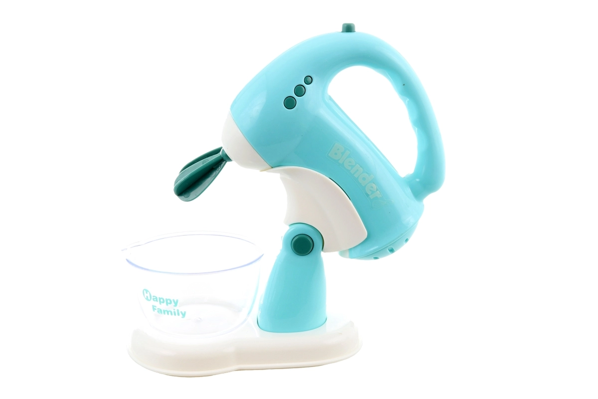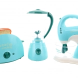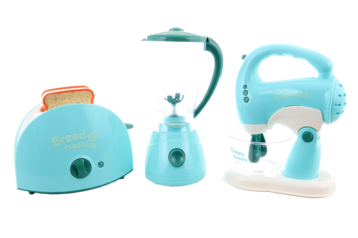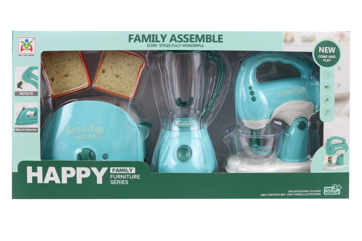 Cet ensemble d’appareils de cuisine comprend un grille-pain, un mixeur et un batteur. Chaque appareil fonctionne avec 2 piles AA, non incluses. Après insertion des piles, le grille-pain s’allume et émet des sons, le mixeur tourne et émet des sons, le batteur s’allume, émet des sons et ses fouets tournent. Matériau : plastique. Emballé en boîte. Dimensions de l’emballage env. 43 × 22 × 9,5 cm. Âge 3+.