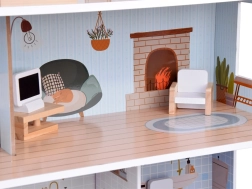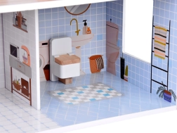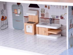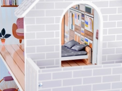 Chaque étage propose une pièce différente : cuisine, salle de bain, salon, salle à manger et chambre avec balcon. Des papiers peints et décorations réalistes stimulent l’imagination et promettent de longues heures de jeu.