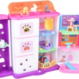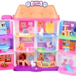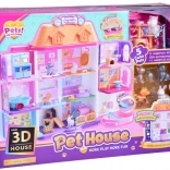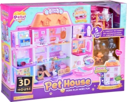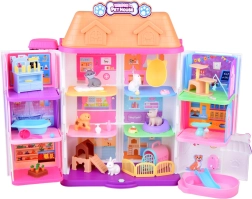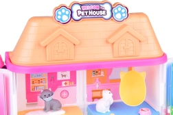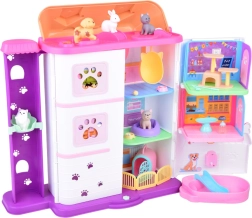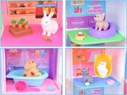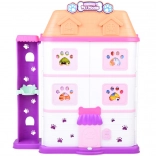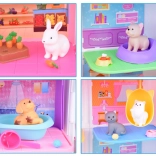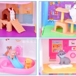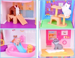 La maison propose 11 pièces bien pensées, un ascenseur avec panier, une terrasse avec piscine et toboggan ainsi qu’une sonnette pour un jeu encore plus réaliste. Sont incluses des figurines en gomme (2 chiens, 2 chats et 1 lapin) et de nombreux accessoires – de la baignoire et des gamelles, en passant par des couchages et des griffoirs, jusqu’à la table d’examen et le lit d’hôpital.