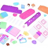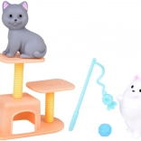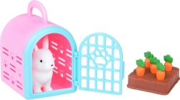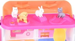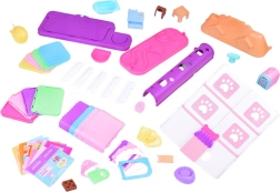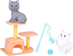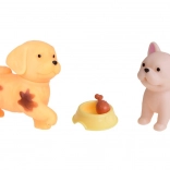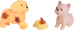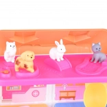 La boîte contient 2 chiens, 2 chats et un lapin en gomme souple, ainsi que des meubles et des accessoires pour les soins, le jeu et le repos.