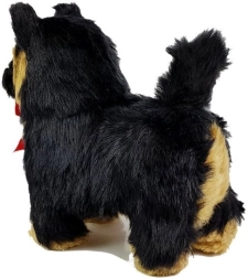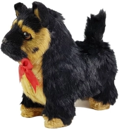 Pelage noir et brun, yeux foncés et nœud rouge confèrent au jouet un aspect fidèle et assurent une douceur maximale au toucher.
