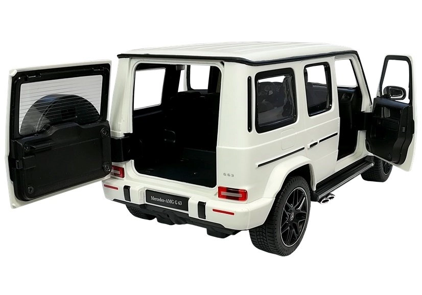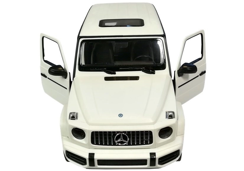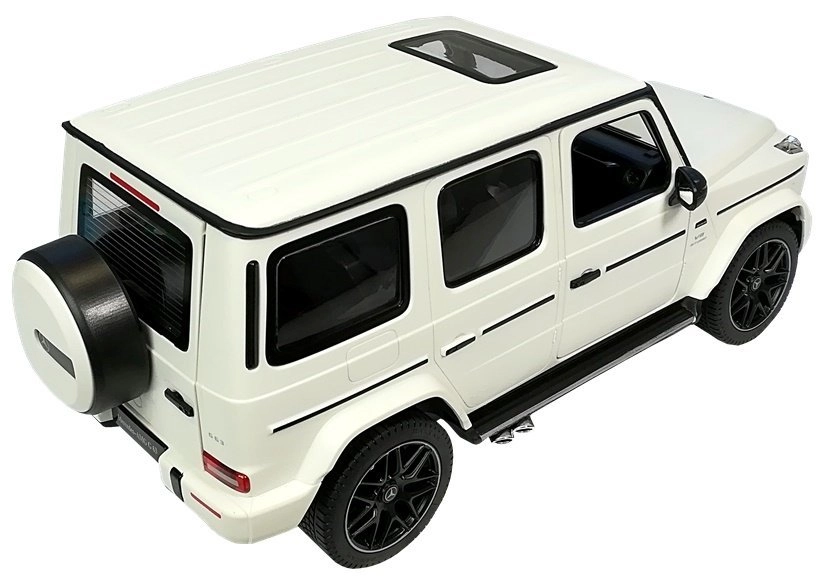 Le jouet est emballé dans une boîte élégante avec une grande fenêtre transparente permettant d’observer en détail le contenu du coffret. Grâce à son emballage, c’est une idée cadeau idéale. Le véhicule R/C Mercedes G63 blanc nécessite 5 piles AA pour fonctionner et la télécommande nécessite 2 piles AA (non incluses).
