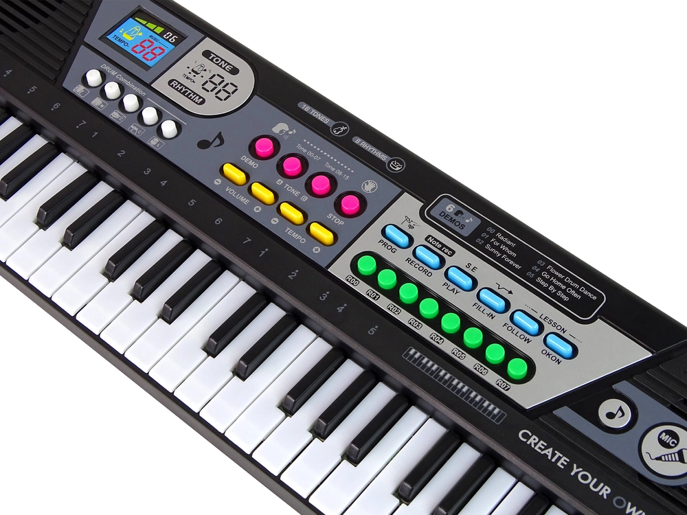 Ce clavier dispose de 49 touches, ce qui permet un jeu facile et naturel. Le microphone intégré permet de chanter des chansons préférées, ce qui plaira certainement aux enfants qui souhaitent expérimenter avec la voix. Les boutons sont faciles à utiliser et, grâce à son design ergonomique, l’utilisation du produit est très confortable. Sa construction légère permet de transporter le jouet et de le poser sur une table ou un bureau, afin que votre enfant puisse donner ses prestations dans n’importe quel coin de la maison. La prise d’entrée externe permet d’écouter des chansons préférées.