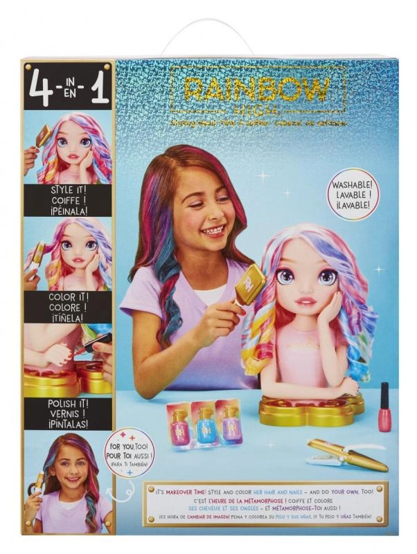 Une toute nouvelle tête à coiffer inspirée de la poupée Rainbow High la plus populaire, Bella. Tu peux créer des mèches, teindre les cheveux ou vernir les ongles.