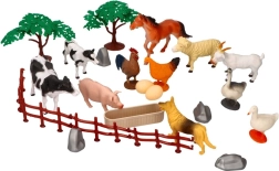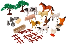 Le set comprend des animaux en plastique de différentes tailles, y compris des vaches, des chevaux, des moutons, des poules, des arbres et d’autres accessoires comme des clôtures, des pierres et des œufs, favorisant le développement éducatif et créatif.