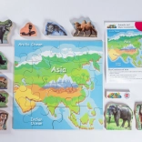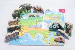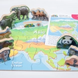 Puzzle en bois avec un motif de l’Asie et de ses animaux, un excellent outil éducatif qui permet aux enfants de découvrir les continents et leur faune de manière ludique. Il comprend 16 pièces pour assembler la carte et 10 animaux autoportants, représentés de façon réaliste.