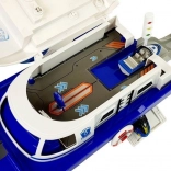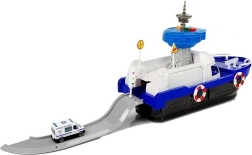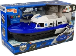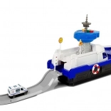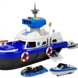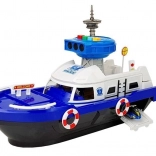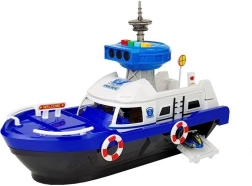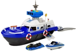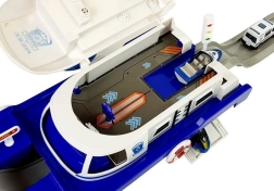 Ce navire de police robuste sur roulettes offre de nombreux éléments interactifs : pont supérieur ouvrant, rampe arrière pour les véhicules et compartiment sous le pont. La tour de contrôle émet des signaux de police avec lumière et son (piles AG13 incluses). Grâce aux détails soignés, bouées de sauvetage et marquages, le jeu est réaliste et captivant.
