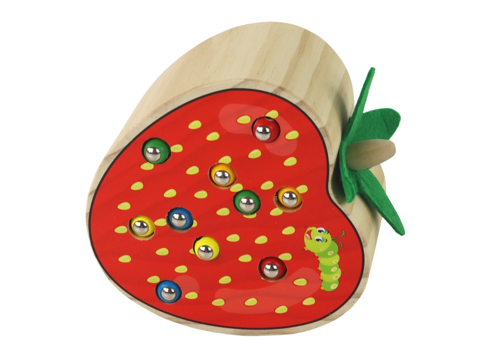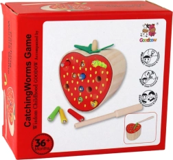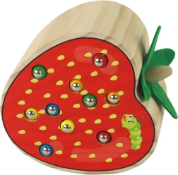 Le jeu consiste à attraper, à l’aide d’une baguette en bois munie d’un aimant, d’adorables petits vers ingénieusement cachés dans de jolis trous d’une fraise en bois. Le tout-petit doit ensuite les remettre précisément à leur place. C’est un défi qui développe non seulement la concentration, mais améliore aussi l’habileté manuelle, la coordination des mouvements et la motricité.