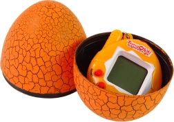 Notez que le Tamagotchi est caché dans un grand œuf orange, et à l’intérieur se trouve un petit animal électronique dont vous pouvez prendre soin !