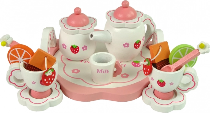 Adorable service à thé en bois au design blanc et rose avec motifs de fraises, idéal pour les goûters et jeux de thé des enfants. Encourage la créativité, les jeux de rôle et la motricité fine. Comprend un plateau avec poignées, une théière, 2 tasses, un pot à lait, des cuillères et des accessoires. Conception sûre en bois, durable et parfaite comme cadeau.