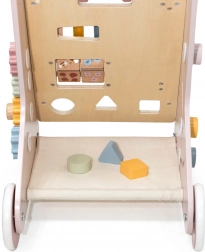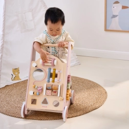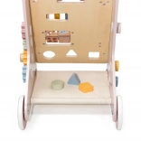 La trottinette contient un miroir, des blocs tournants et d'autres activités qui soutiennent les compétences motrices et cognitives.