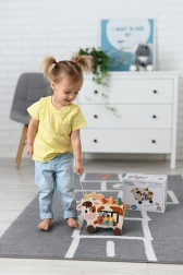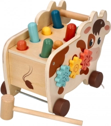 Cette vache en bois est un excellent choix pour un apprentissage ludique à la maison comme à la maternelle. Grâce à la combinaison des chevilles à marteler, des engrenages colorés et des activités numériques, les enfants exercent leur concentration, la coordination œil–main et les premiers calculs. Le jouet est mobile – il possède des roulettes et une ficelle pour le tirer, afin d’accompagner les enfants dans leurs découvertes.