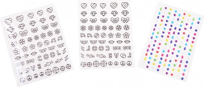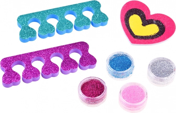 Quatre couleurs de paillettes et des autocollants pour une décoration spectaculaire sont complétés par de doux séparateurs d’orteils – vernir les ongles de pieds devient confortable et précis.