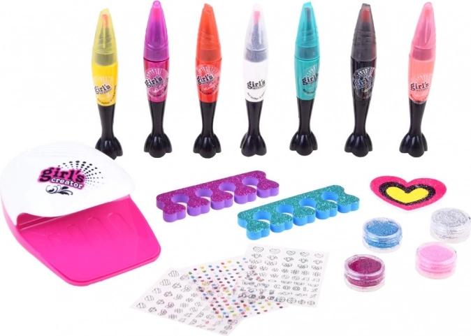 La boîte contient tout pour une manucure et pédicure ludique : 7 couleurs intenses, 4 types de paillettes, des autocollants à contours et à pois colorés, une lime en forme de cœur et de doux séparateurs pour vernir confortablement les orteils. Il suffit d’une pincée d’imagination et les ongles seront toujours différents.
