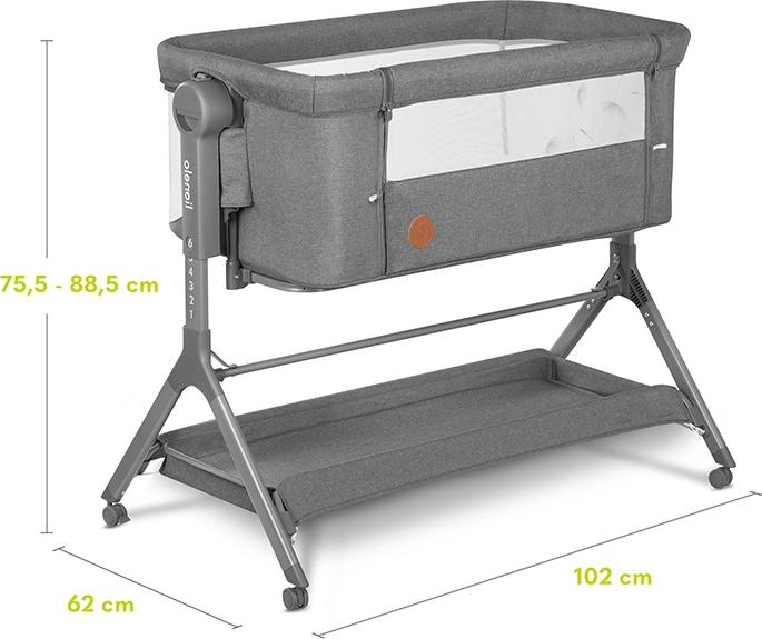 La paroi latérale amovible permet le couchage côte à côte avec les parents, apportant non seulement du confort mais aussi de la sécurité grâce aux sangles de fixation au lit des parents. Vous apprécierez également l’espace de rangement pour les jouets ou les accessoires indispensables, ainsi que le sac pratique pour transporter facilement le lit plié.