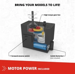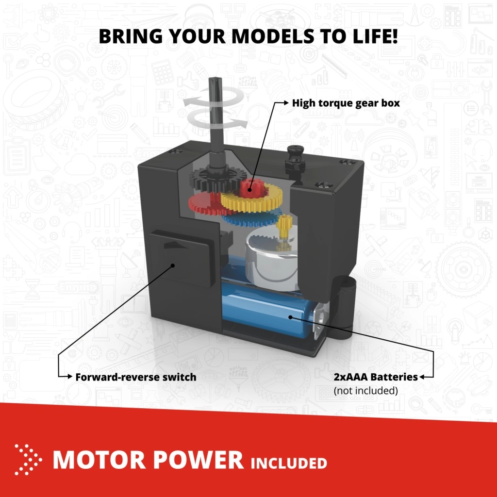 Le set inclut un moteur avec inversion du sens de rotation. Donnez vie à vos modèles et faites-les rouler ou se déplacer.