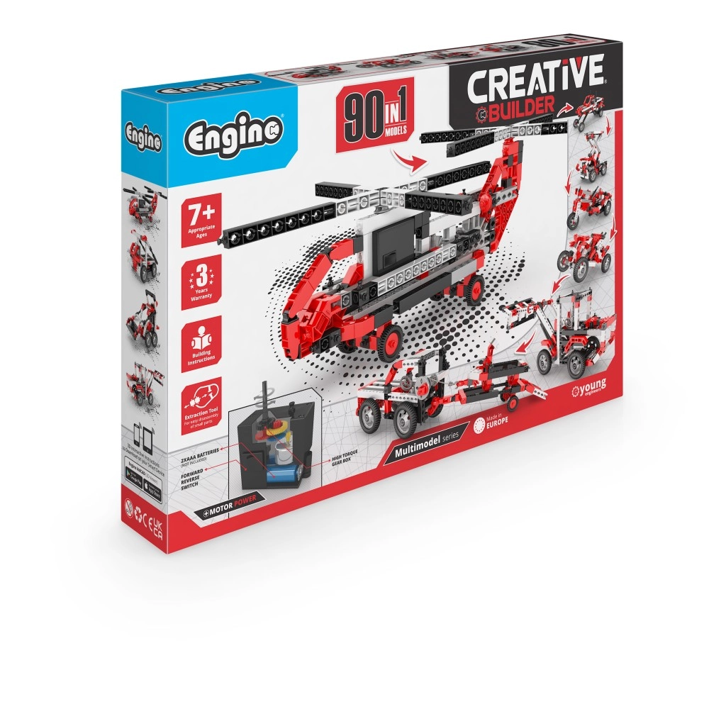 Découvrez des possibilités de construction infinies avec le ENGINO Creative Builder 90 en 1 doté d’un moteur pour animer vos modèles. Avec un seul set, vous pouvez assembler jusqu’à 90 modèles différents, des voitures et motos aux avions et hélicoptères. Grâce à l’application interactive kidCAD 3D, faites pivoter les modèles, zoomez et apprenez étape par étape. Convient à partir de 7 ans, compatible avec les autres kits ENGINO.