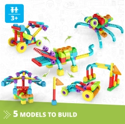 Avec ce kit, les enfants peuvent construire différents modèles, tels que des animaux et des petites voitures. Un manuel et une application mobile sont inclus, guidant pas à pas les étapes de construction. L'application interactive Engino kidCAD® permet d'afficher les modèles en 3D pour une meilleure visualisation.