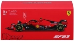 Découvrez le modèle FERRARI F1 SF-23 de 2023 signé BBURAGO, réalisé avec grand soin. La carrosserie en métal avec des éléments en plastique offre des proportions réalistes, la livrée d'équipe authentique de la Scuderia Ferrari et le numéro de course 55 du pilote Carlos Sainz. Idéal pour une vitrine, un bureau ou comme cadeau pour les passionnés de la reine du sport automobile.