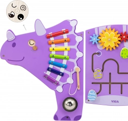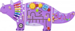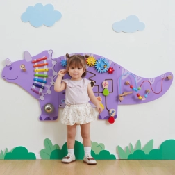 Ce tableau mural coloré en bois en forme de tricératops de la marque VIGA TOYS offre de nombreuses activités pour le développement des enfants. Il comprend un xylophone avec maillet et une cloche/gong, des roues dentées rotatives, un labyrinthe avec 5 œufs à ouvrir (miroir + petits dinosaures), des yeux changeants actionnés par un bouton et une piste motrice captivante avec lanceur de perles. Idéal pour la motricité fine, la coordination œil–main et la découverte sensorielle.